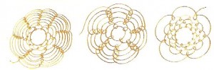 Začíname malým počtom slučiek a postupne pridávame (viac slučiek do jedného oblúčika), alebo hneď od začiatku veľkým počtom očiek. Dodržiavame pritom vzor.